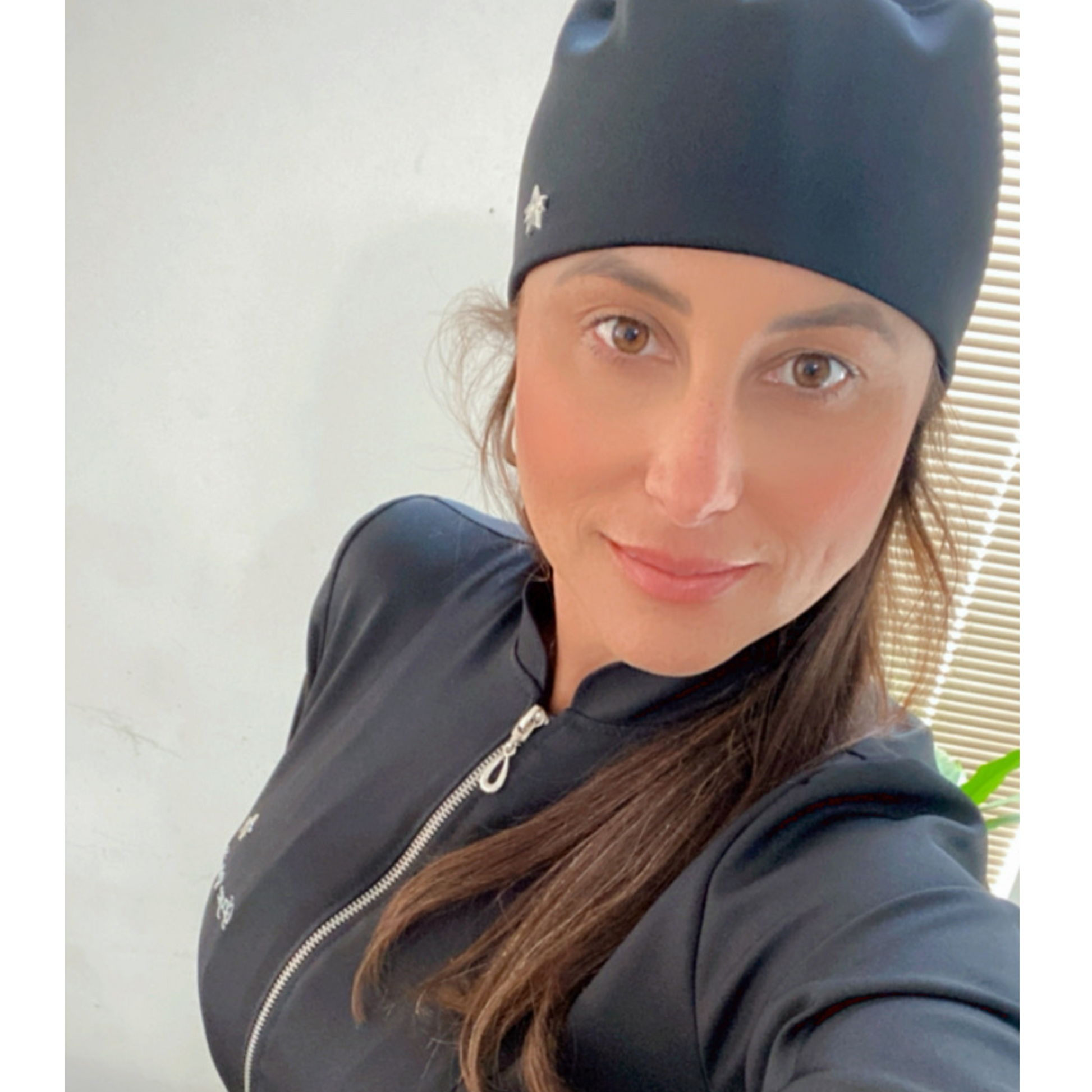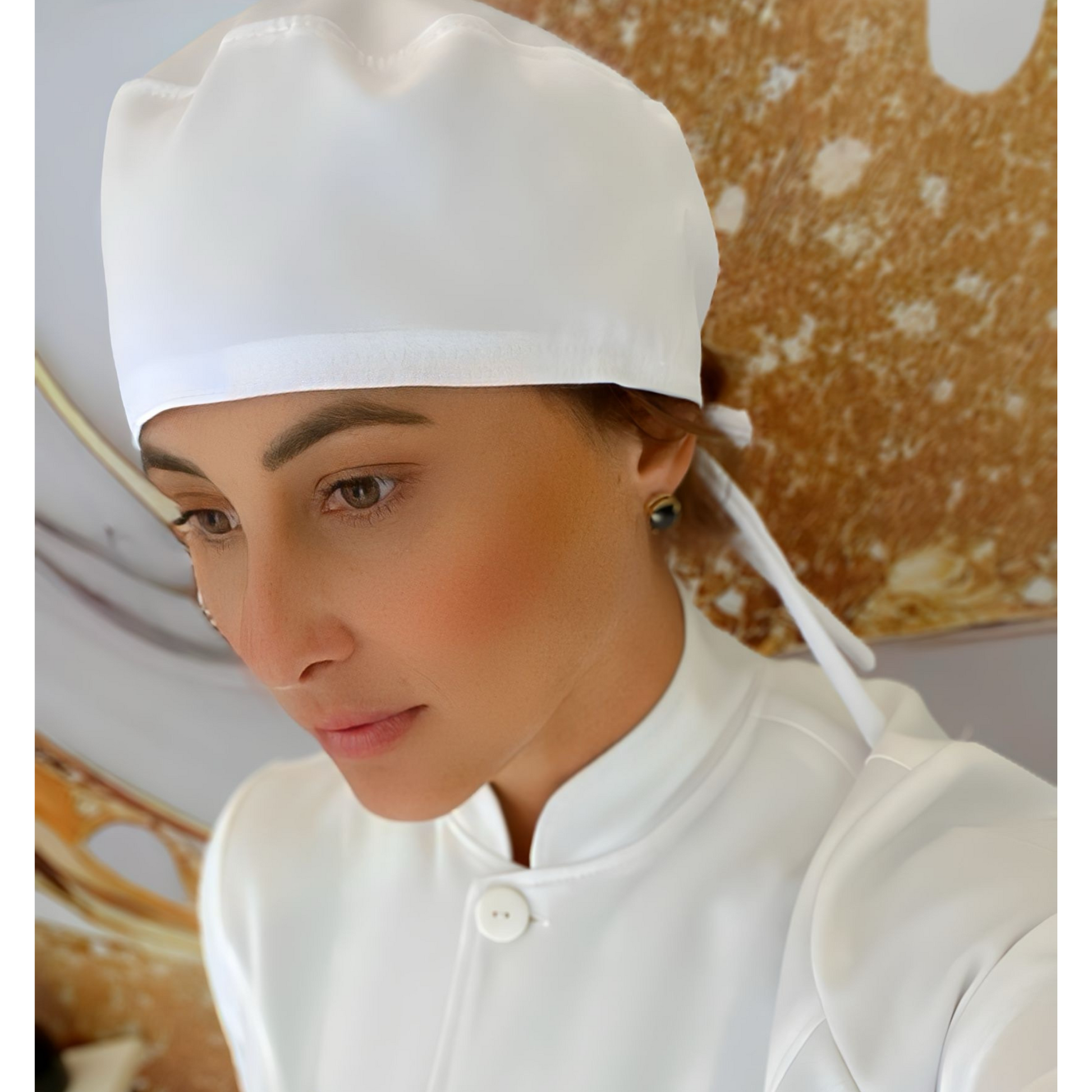 Gorro confeccionado em tecido gabardine com elastano, possui amarração na nuca que se ajusta a sua cabeça.
