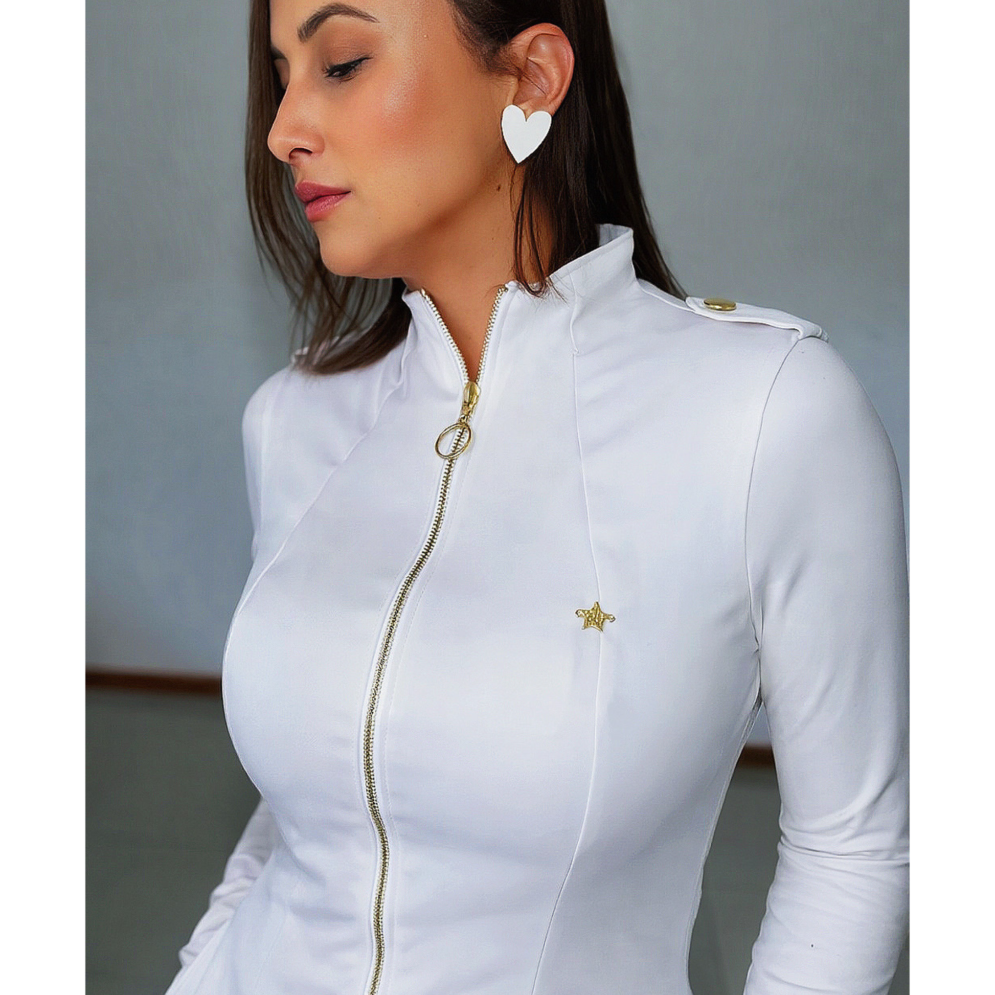 O modelo Íris é confeccionado em tecido importado com elastano e não necessita passar. Possui um corte moderno e slim valorizando a silhueta feminina. Possui bolso faca lateral e fechamento em zíper de metal dourado com puxador de argola.