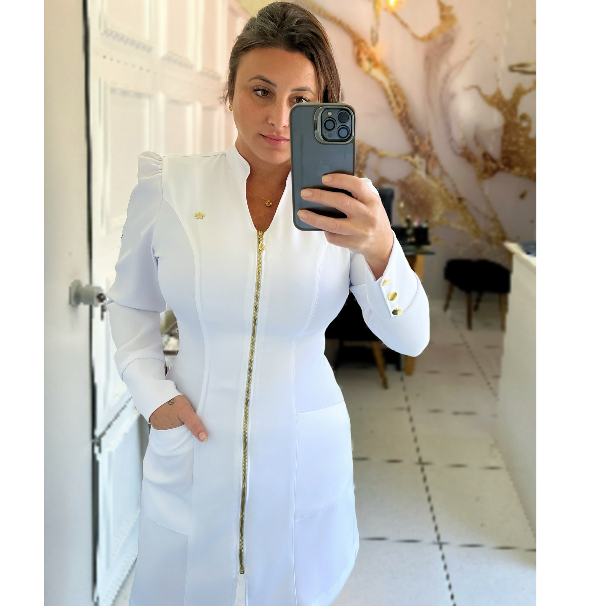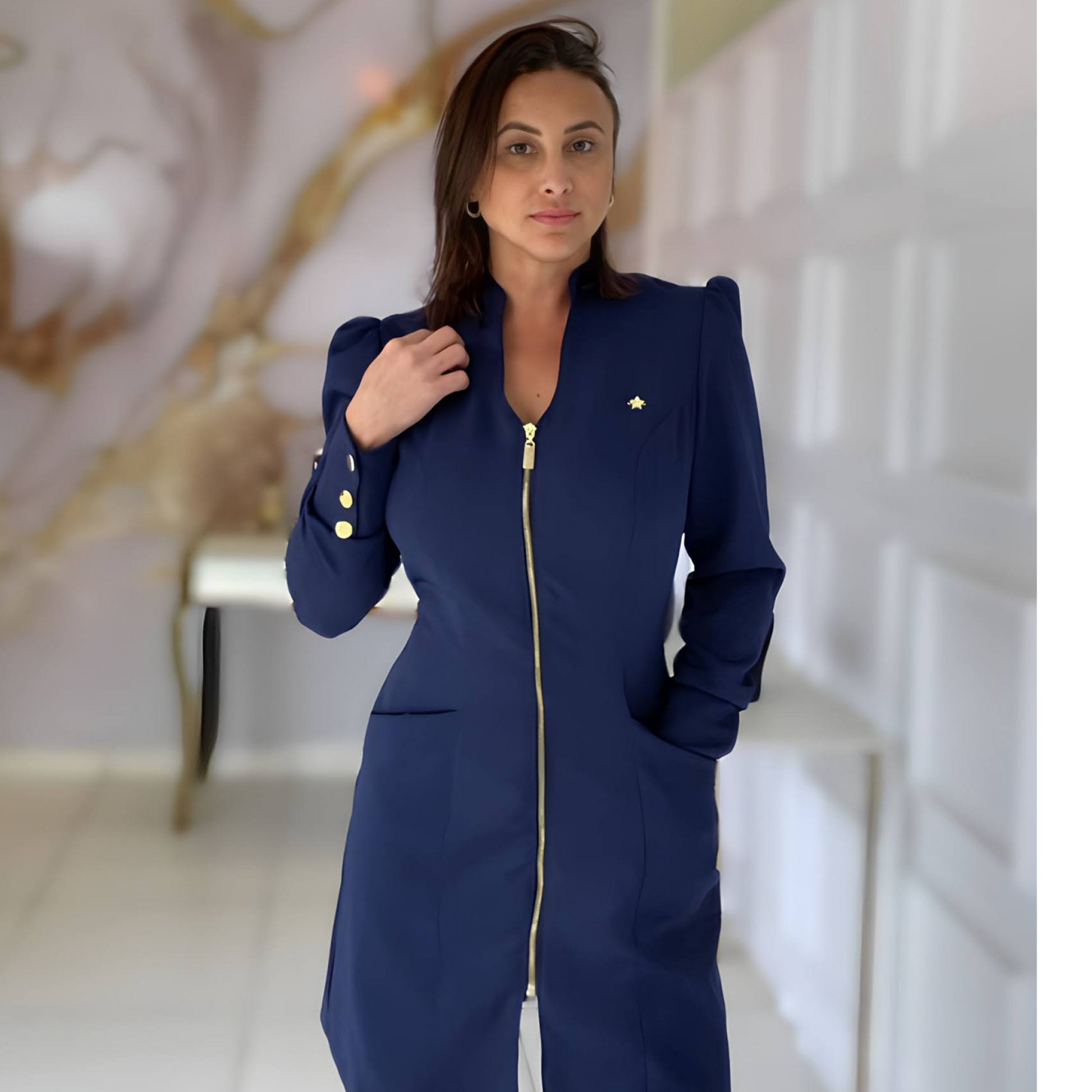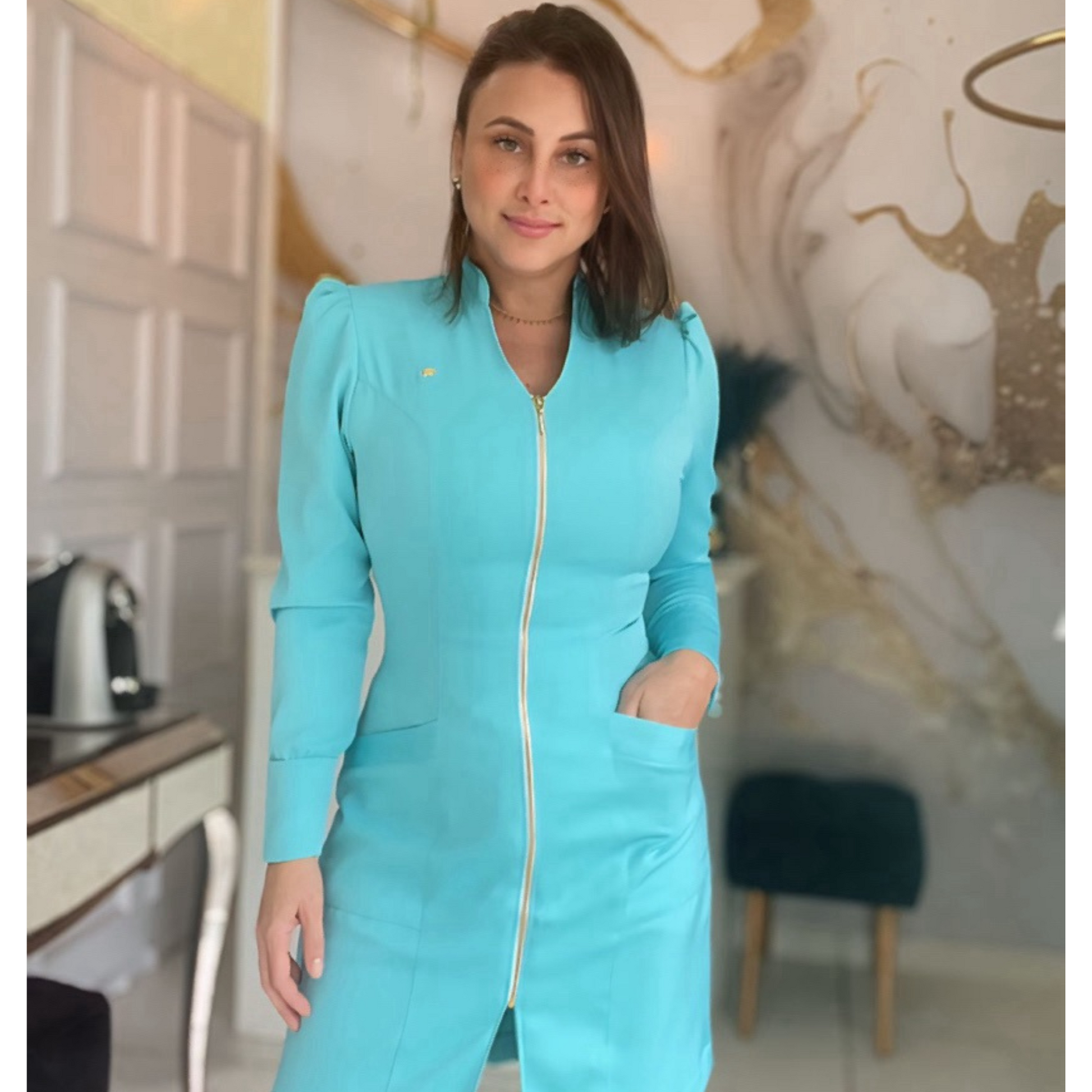 O Jaleco Adhara é para quem procura qualidade, beleza e conforto. Seu tecido exclusivo com elastano, além da modelagem slim e mangas bufantes, oferece toque suave e flexibilidade para você se movimentar ao máximo. Os punhos com botões de metal dourado banhado, juntamente com os bolsos frontais, o deixam ainda mais luxuosos!