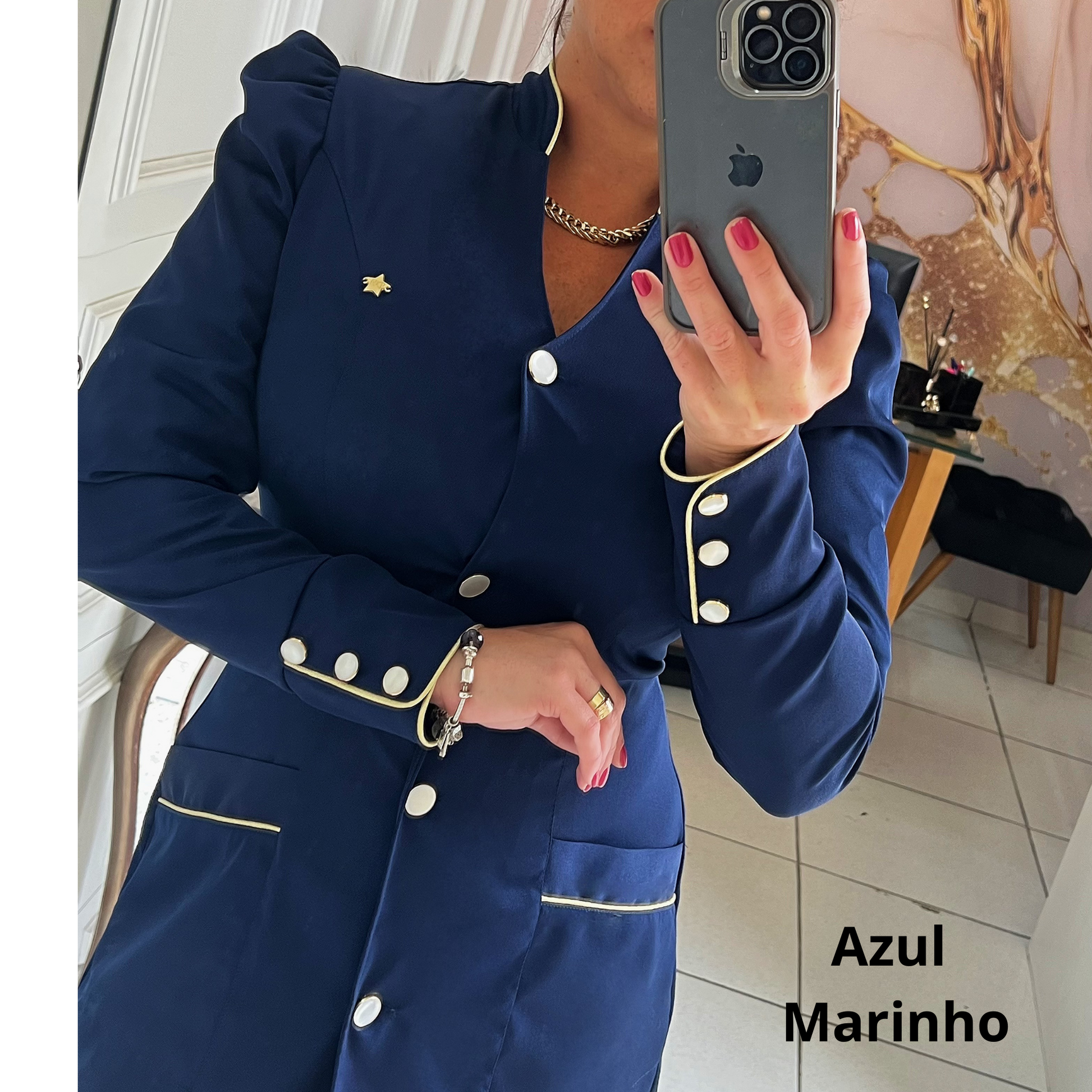 O Jaleco Alice Gold é uma peça perfeita para quem busca modernidade e moda. O tecido importado com elastano é suave ao toque e resistente ao amassado. Os detalhes em viés dourados nos punhos, bolso e gola trazem todo o charme da peça e ainda modelam e definem seu corpo com seu recorte acinturado. Uma peça que redefine o seu estilo!