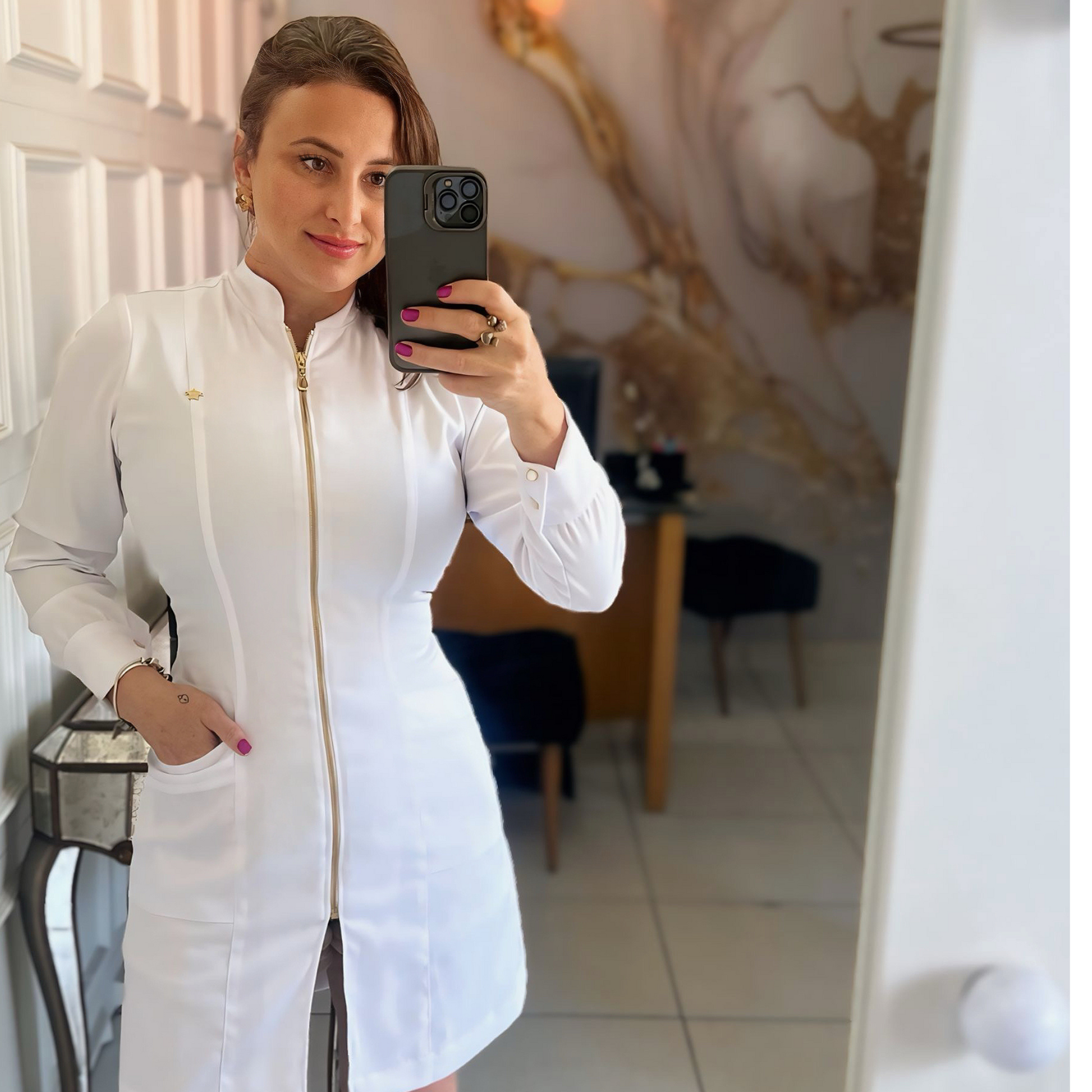 Jaleco Maia é um jaleco feminino elegante e moderno. Feito com gabardine premium em conjunto com elastano, oferece flexibilidade e conforto. O fechamento é realizado através de zíper em metal resistente e botões com misto de metal folheado dourado e madrepérolas como fechamento. Com modelo slim e acinturado, o jaleco Maia é o grande destaque e confere um toque de moda ao seu estilo profissional.