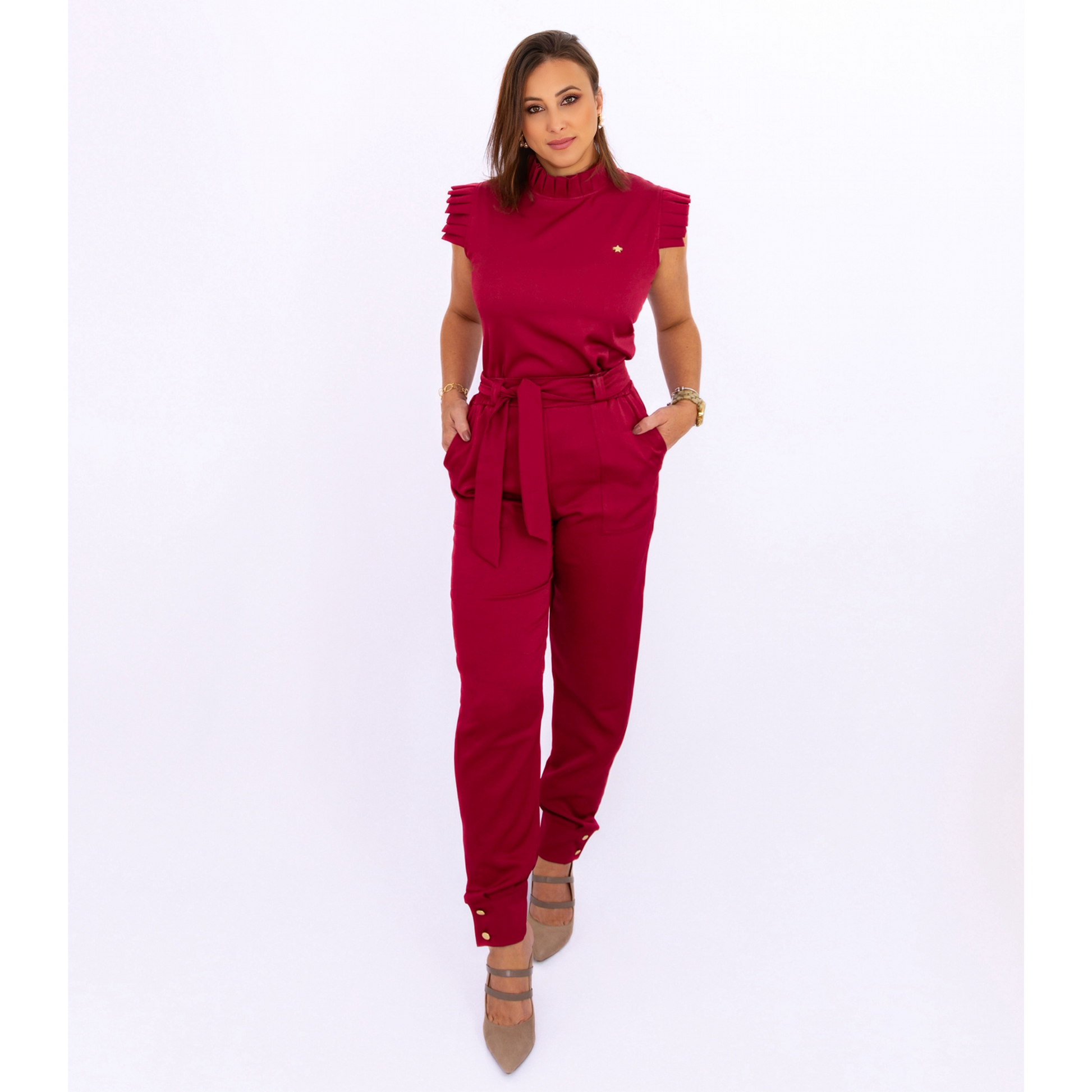 Sua calça é estilo alfaiataria cintura alta, com modelagem reta e slim. Possui elástico na lateral do cós para trazer mais conforto, e uma faixa na cintura que dá todo o charme e elegante a peça ... além de abotoamento na barra com dois botões super delicados folheados a ouro.